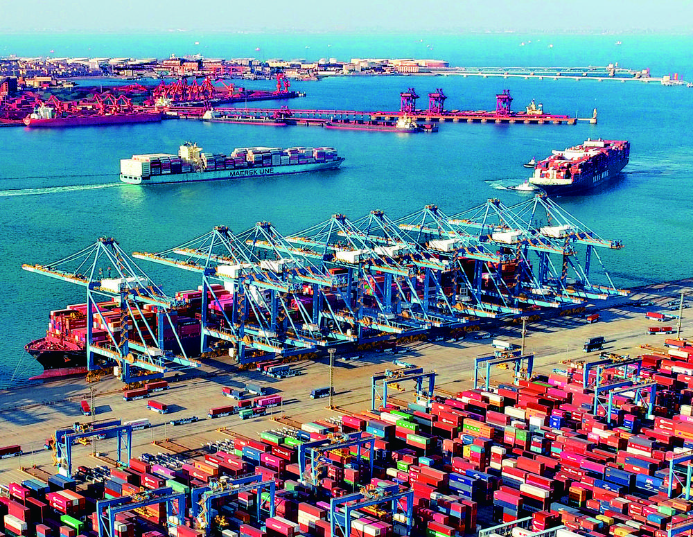 ▼2月6日,山东港口青岛港全自动化码头的货轮在装卸作业。春节假日,青岛港日均在港作业船舶超过100余艘次,全港吞吐量同比增长8.8%,超计划7.6%。张进刚摄(中经视觉)