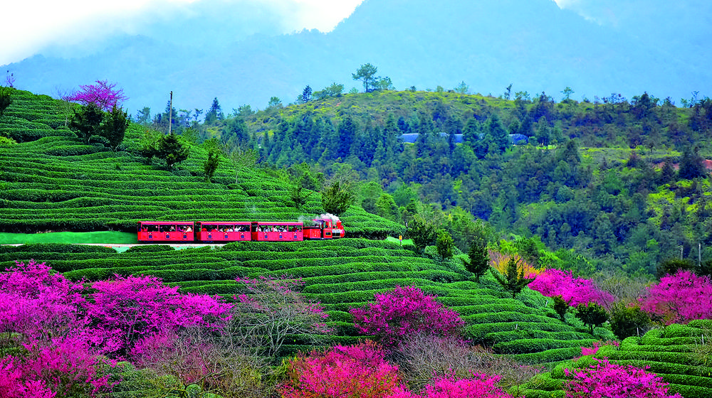 永福镇地处高山盆地,气候条件适宜种植樱花。近年来,该镇围绕“樱花+茶园”,打造“樱花小火车”项目,为游客营造新奇的观光旅游体验。朱海鹏摄(中经视觉)