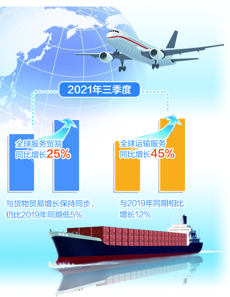 本报日内瓦讯(记者杨海泉)世界贸易组织(WTO)近日发布服务贸易报告称,2021年三季度,全球服务贸易同比增长25%,与货物贸易增长保持同步,计算机、金融和商业服务等数字化可交付服务是增长的主要驱动力。运费飙升使全球运输服务同比增长45%,与2019年同期相比增长12%。