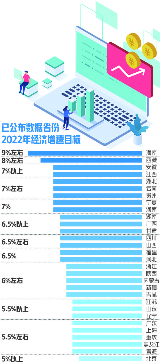 记者梳理发现,对照2021年各地经济增速,除了西藏、河南、宁夏、河北,有26个省份下调了今年增速目标。其中,多数省份的预期增速目标值在5.5%至7%之间,中西部地区目标增速相对较高。