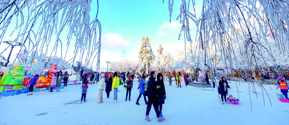 近日,游客在江西省庐山市牯岭核心景区观赏冰雪美景。每年春节前后,庐山都会出现冰挂、雾凇景观,吸引游客前来观光游览,是南方著名的冰雪旅游胜地。