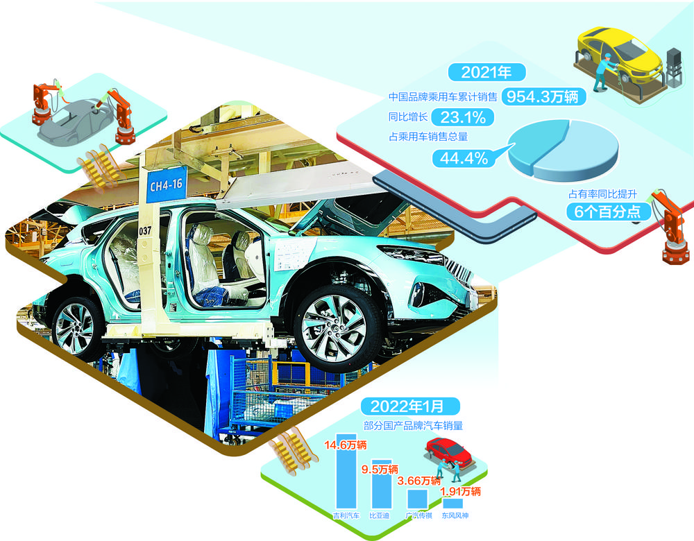 最直接的表现就是市场占有率稳步提升。中汽协数据显示,2021年,中国品牌乘用车累计销售954.3万辆,同比增长23.1%,占乘用车销售总量44.4%,接近历年最好水平,占有率比上年提升6个百分点。如果算上商用车,中国品牌汽车市场占有率实际上已超过50%。
