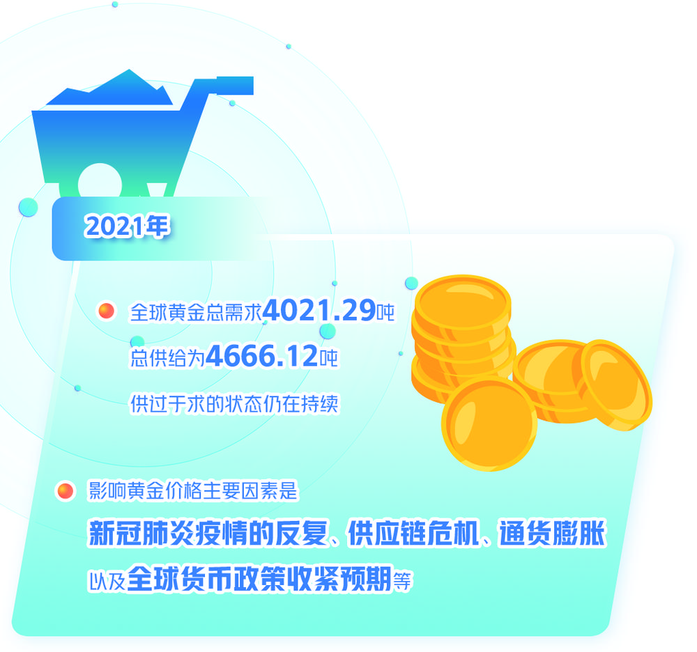 方正中期期货有限公司贵金属研究员史家亮认为,2021年,全球黄金总需求4021.29吨,总供给为4666.12吨,供过于求的状态仍在持续。不过,黄金价格并没有持续大幅回落,主因在于黄金的商品属性对价格的影响仍在弱化,黄金的债券属性和货币属性是黄金价格走势的核心影响因素,而这又与美联储货币政策走势密切相关。