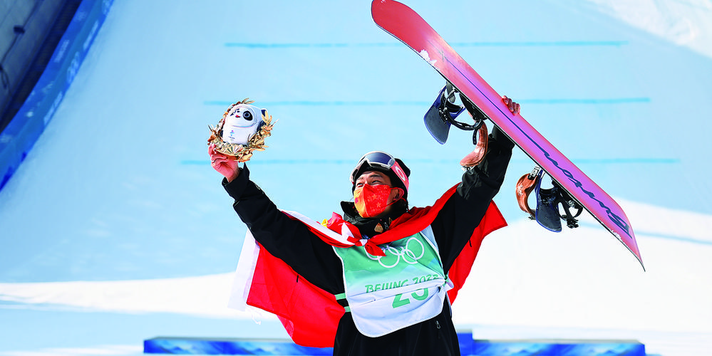 上图 2月15日,中国队选手苏翊鸣在夺冠后庆祝。当日,北京2022年冬奥会单板滑雪男子大跳台决赛在北京首钢滑雪大跳台举行,中国队选手苏翊鸣夺得金牌,并改写两项历史:摘得中国单板滑雪冬奥首金,将中国队单届冬奥会5金的纪录推高到6金。 新华社记者 黄宗治摄