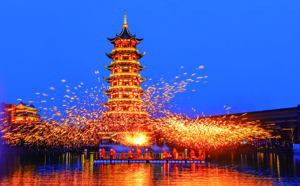 2月13日,湖北荆州方特东方神画主题乐园进行打钢花民俗表演。春节以来,荆州通过开展新春集市、非遗民俗展演、篝火晚会、烟火秀等形式多样、内容丰富的夜间游玩活动,吸引游客参与,激活了夜间文旅消费市场。
