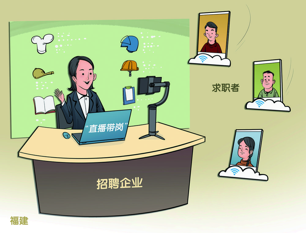 近日,一场“直播带岗”招聘会在7个省份拉开帷幕,用工需求旺盛的福建福州设立主会场,云南、宁夏等6个中西部重点劳务输出省份设立分会场。在此次招聘会上,企业代表变身“主播”,直播推介企业情况、岗位需求,有求职意向的务工人员可一对一在线咨询。据统计,直播当天达成初步就业意向4531人。“直播带岗”打破时空限制,既方便求职者足不出户就了解丰富的职业岗位信息,又能够精准对接用人单位的用工需求,是稳就业服务民生的又一积极探索。期待这种新型的招聘方式让更多的求职者找到心仪的岗位。