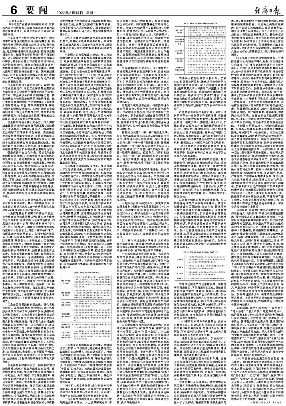2022年经济社会发展工作任务繁重,意义重大。我们要更加紧密地团结在以习近平同志为核心的党中央周围,高举中国特色社会主义伟大旗帜,以习近平新时代中国特色社会主义思想为指导,弘扬伟大建党精神,增强“四个意识”、坚定“四个自信”、做到“两个维护”,按照党中央、国务院决策部署,自觉接受全国人大的监督,认真听取全国政协的意见和建议,攻坚克难、砥砺奋进,努力完成全年目标任务,以实际行动迎接党的二十大胜利召开,为把我国建设成为富强民主文明和谐美丽的社会主义现代化强国、实现中华民族伟大复兴的中国梦不懈奋斗!