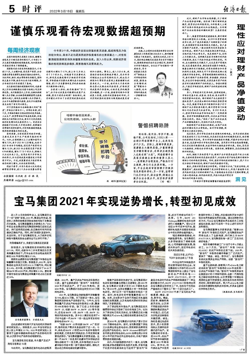 在3月16日的财报年会上,宝马集团交出了一份“逆势”答卷,2021年,集团全年收益、税前收入和净利润等多项财务指标均创下本集团历史新高。宝马集团董事长齐普策认为:“2021年的业务发展证明宝马集团的转型已经初见成效。我们坚持既定战略,在正确的时间向市场提供正确的产品。同时,我们的团队紧密协作,共克时艰。对于宝马集团而言,大刀阔斧实现转型与漂亮的财务业绩完全可以并行不悖。”