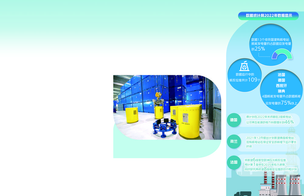 核电一直是欧盟发电的主力军。欧盟统计局2022年数据显示,包括法、德在内的欧盟13个成员国建有核电站,核能发电量约占欧盟总发电量的25%。欧盟运行中的核反应堆共计109个,其中最大的核电生产国为法国,其核能发电量约占欧盟核能总发电量的52%;其次为德国、西班牙和瑞典,上述四国核能发电量共占欧盟核能总发电量的四分之三以上。中东欧的斯洛伐克、匈牙利、保加利亚和捷克等国也都建有核电站。