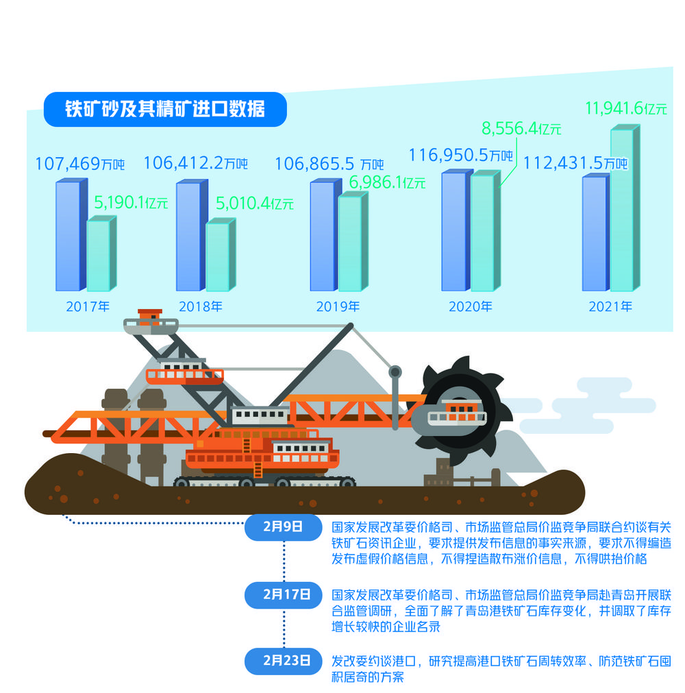针对此前铁矿石市场供需总体稳定、港口库存持续上升至多年高位,但价格仍大幅上涨的异常情况,国家发展改革委价格司、市场监管总局价监竞争局联合组织港口协会及部分港口企业召开专题会议,研究大幅缩短贸易企业铁矿石免费堆存期、提高港口囤积成本、防范过度囤积等相关工作,指导港口企业敦促铁矿石贸易企业释放过高库存,尽快恢复至合理水平。