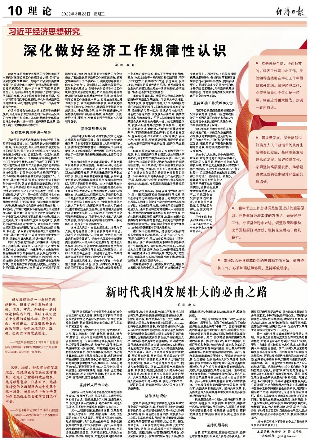 2021年底召开的中央经济工作会议提出了一系列对做好经济工作的规律性认识,包括“必须坚持党中央集中统一领导”“必须坚持高质量发展”“必须坚持稳中求进”“必须加强统筹协调,坚持系统观念”,进一步丰富了习近平经济思想。习近平经济思想科学回答了新时代实现什么样的发展、怎样实现发展这个重大问题。深入学习贯彻习近平经济思想,深化对做好经济工作的规律性认识,对做好新时代经济工作具有重要指导意义。