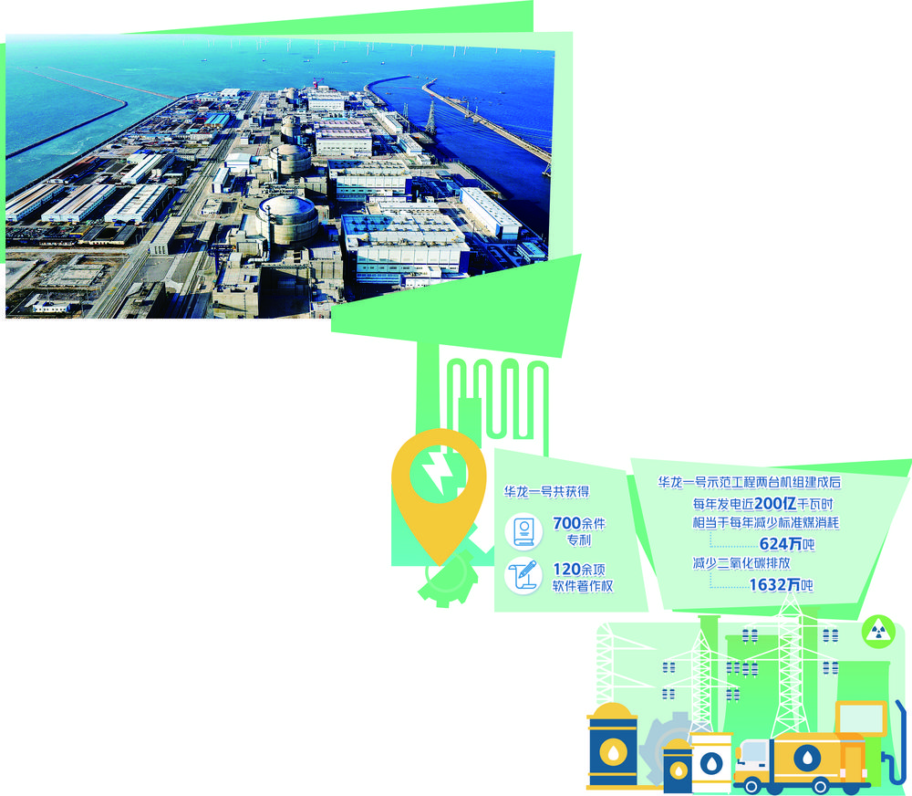 以华龙一号为例,华龙一号示范工程全面建成后,两台机组年发电能力近200亿千瓦时,相当于每年减少标准煤消耗624万吨、减少二氧化碳排放1632万吨,相当于植树造林1.4亿棵,经济社会和环保效应显著,对优化我国能源结构、推动绿色低碳发展、助力实现碳达峰碳中和目标具有重要意义。