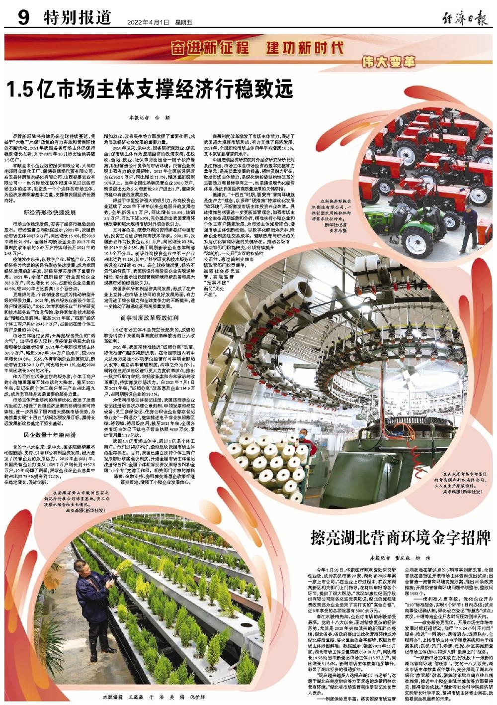 春江水暖鸭先知,企业对市场的冷暖感受最深。党的十八大以来,面对错综复杂的经济形势,尤其是2020年突如其来的新冠肺炎疫情,湖北省委、省政府提出让优化营商环境成为湖北疫后重振、浴火重生的金字招牌,积极为市场主体纾困解难。数据显示,截至2021年12月底,湖北市场主体总量突破650.30万户,同比增长14.98%;当年新登记市场主体113.97万户,同比增长51.56%。新增市场主体数量稳步攀升,彰显了湖北经济的强劲韧性。