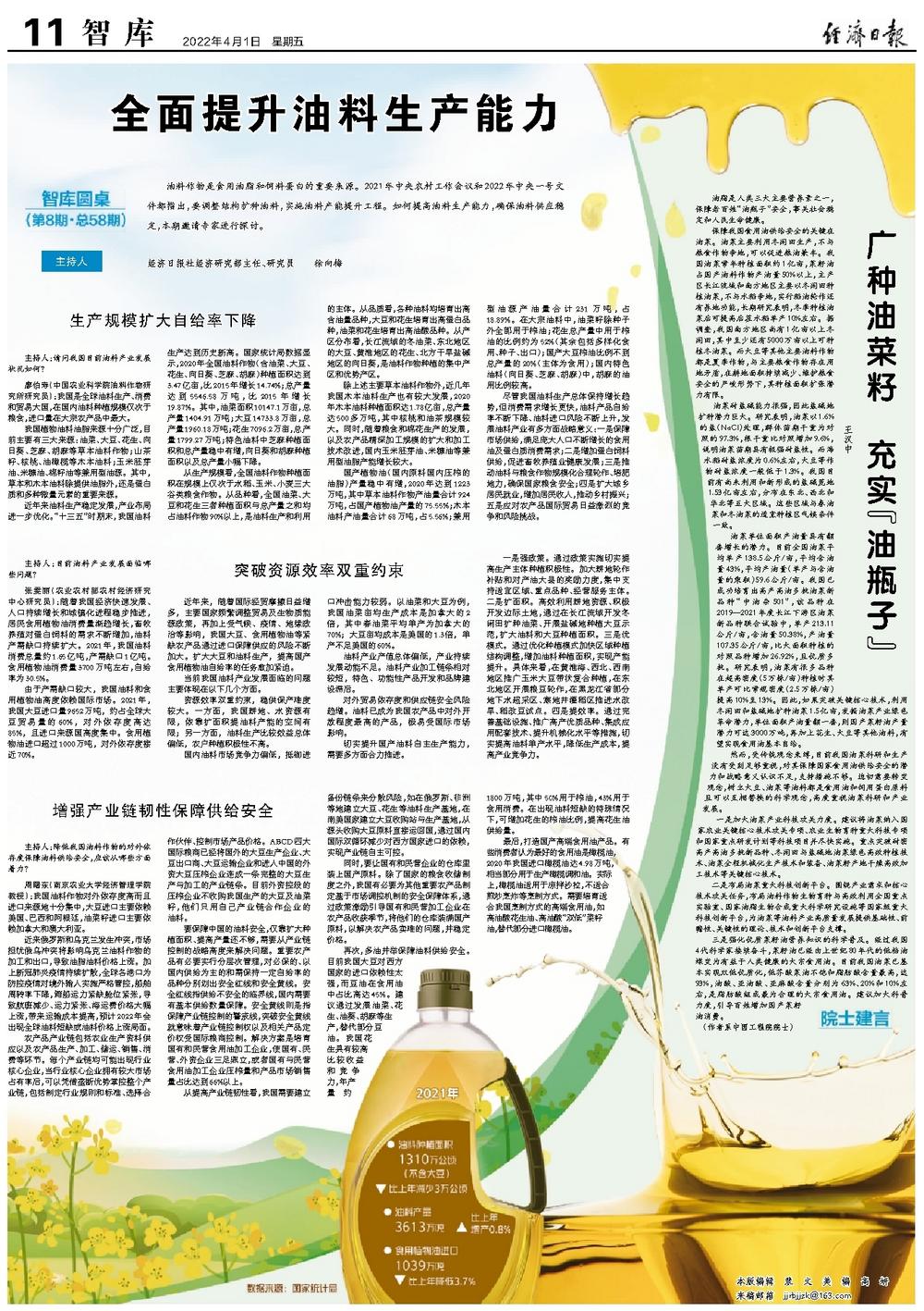 油料作物是食用油脂和饲料蛋白的重要来源。2021年中央农村工作会议和2022年中央一号文件都指出,要调整结构扩种油料,实施油料产能提升工程。如何提高油料生产能力,确保油料供应稳定,本期邀请专家进行探讨。