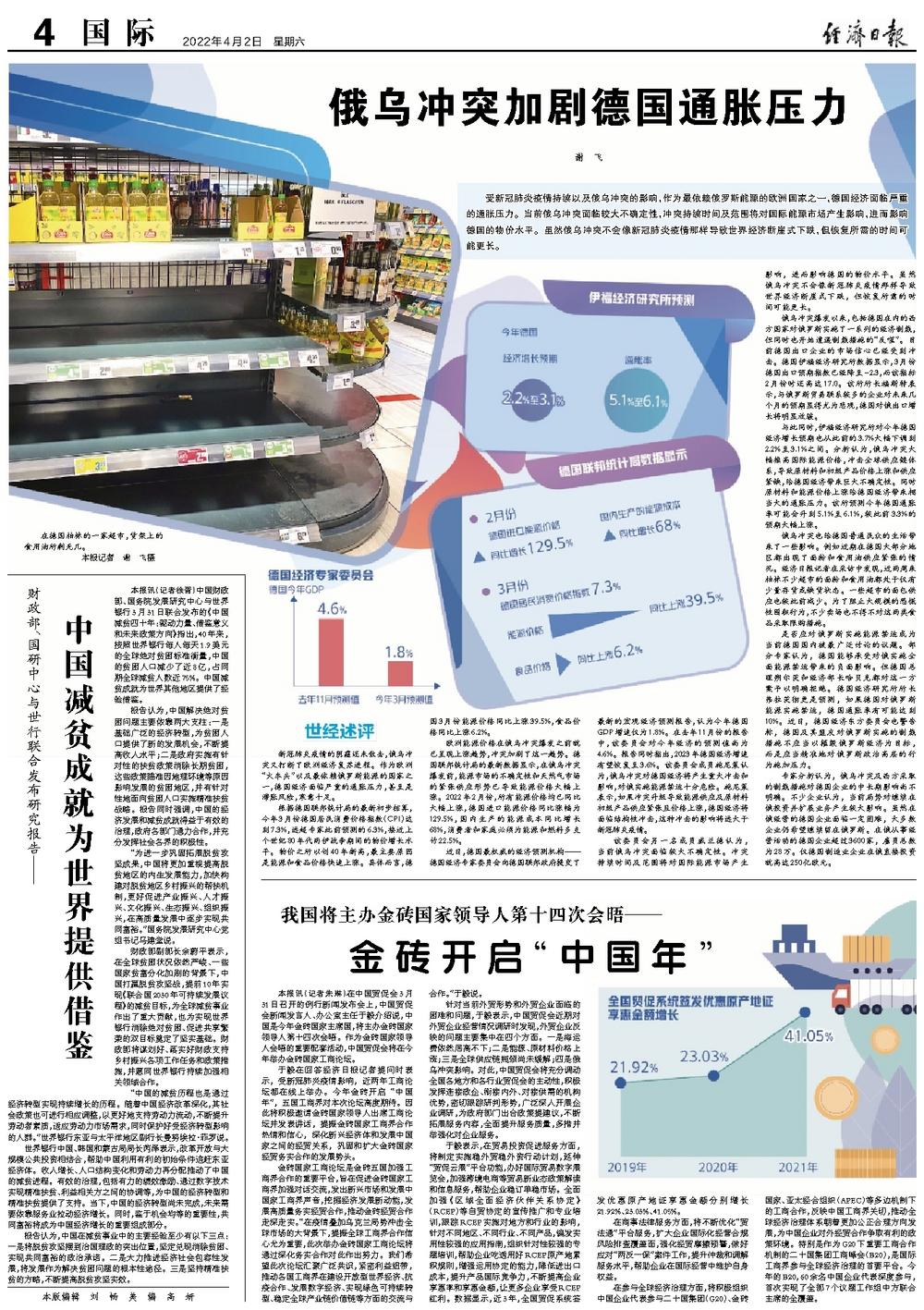 与此同时,伊福经济研究所对今年德国经济增长预期也从此前的3.7%大幅下调到2.2%至3.1%之间。分析认为,俄乌冲突大幅推高国际能源价格,冲击全球供应链体系,导致原材料和初级产品价格上涨和供应紧缺,给德国经济带来巨大不确定性。同时原材料和能源价格上涨给德国经济带来相当大的通胀压力。该所预测今年德国通胀率可能会升到5.1%至6.1%,较此前3.3%的预期大幅上涨。