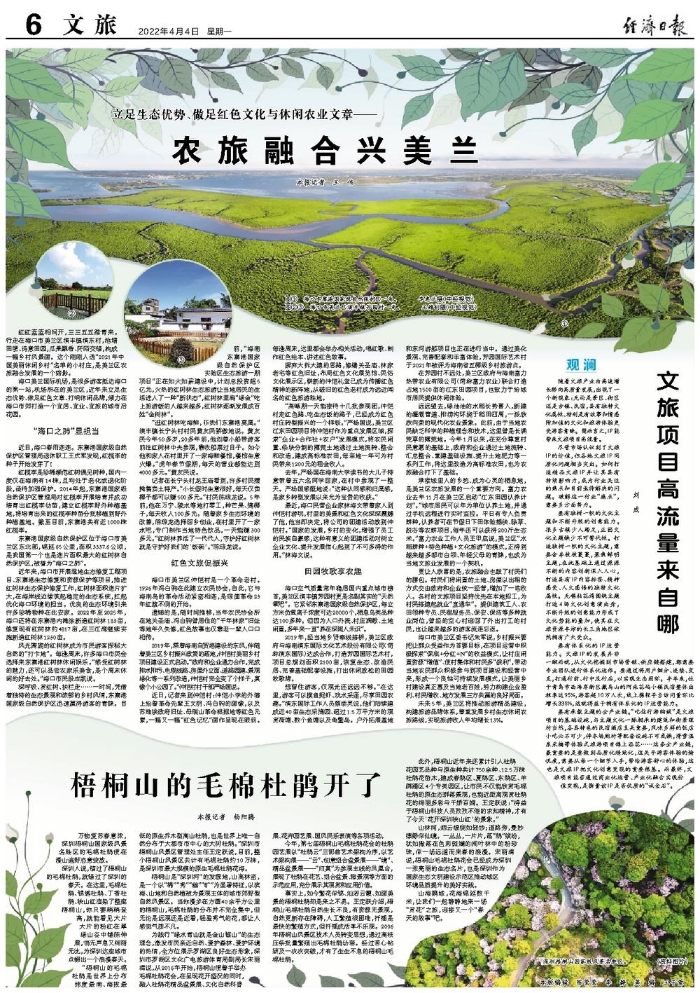 承接城里人的乡愁、成为心灵的栖息地,是美兰区农旅发展的一个重要方向。富力农业去年11月在美兰区启动“江东田园认养计划”。“城市居民可以年为单位认养土地,并通过手机远程进行实时监控。平日有专人负责耕种,认养者可在节假日下田体验插秧、除草、脱谷等农耕项目,每年还可以获得200斤生态米。”富力农业工作人员王甲启说,美兰区“水稻耕种+特色种植+文化旅游”的模式,正得到越来越多都市白领、年轻父母的青睐,也成为当地文旅业发展的一个契机。