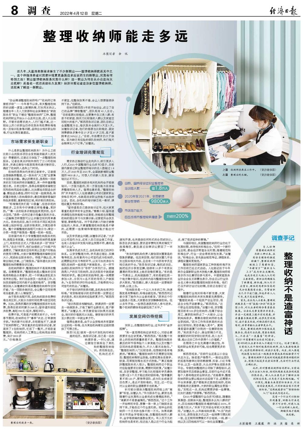 “你会聘请整理收纳师吗?”“收纳师订单接到手软”……今年春节以来,有关整理收纳师的话题一度登上微博热搜,引发网友热议。随着去年1月人力资源和社会保障部在“家政服务员”职业下增设“整理收纳师”工种,整理收纳师职业开始从小众走向主流,进入大众视野。尽管市场需求庞大、入行门槛不高,这一刚站上风口的职业仍存在服务和收费标准难统一及培训乱象等问题,亟待出台相关职业标准,行业发展任重道远。
