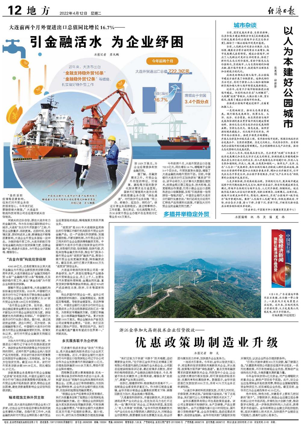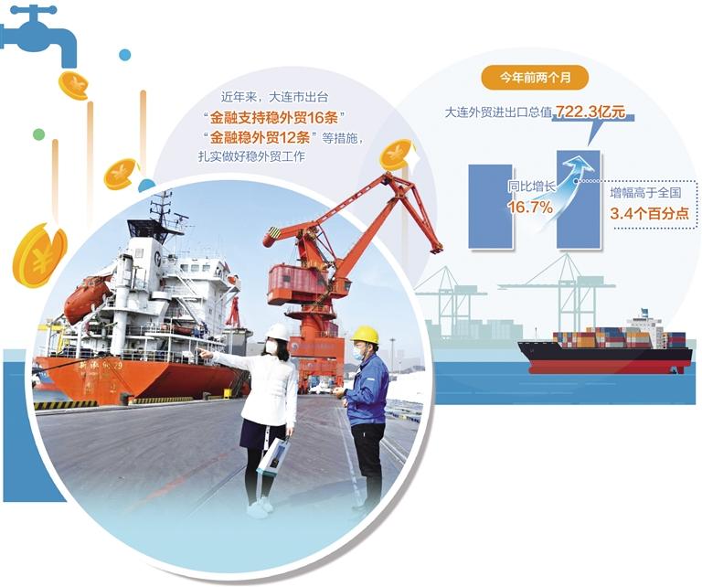 宋斌兵的这份自信,源自大连市有力的金融支持。作为东北地区国际航运中心城市,大连有“东北对外开放窗口”之称,外贸企业数量多、活跃度高。近段时间,受疫情反复、原材料成本上涨、跨境海运不畅等因素影响,大连企业外贸业务面临一定冲击。为做好稳外贸工作,大连市积极引导当地金融机构加大信贷保障力度、创新金融产品、畅通多元服务,为外贸企业纾困解难、增强信心。