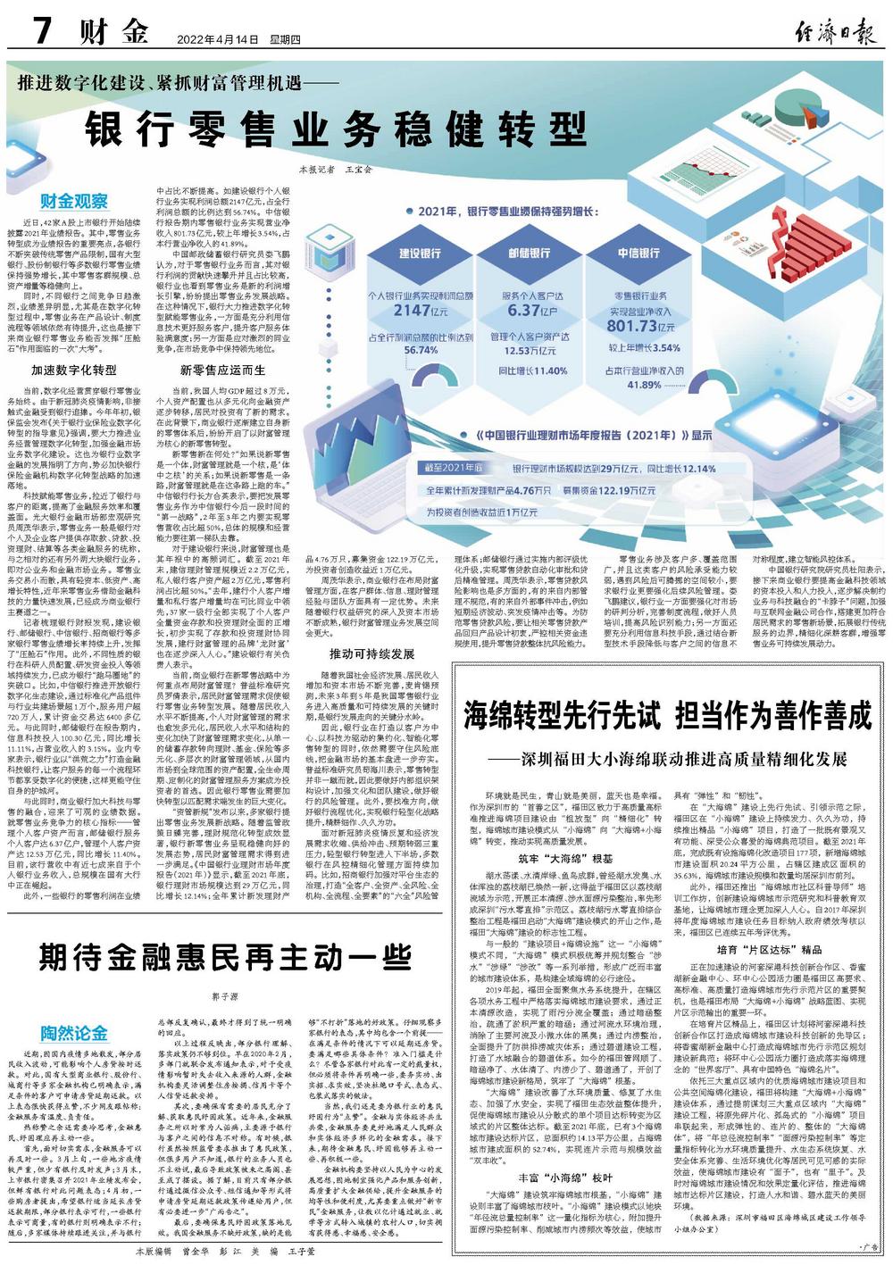 对于建设银行来说,财富管理也是其年报中的高频词汇。截至2021年末,建信理财管理规模近2.2万亿元,私人银行客户资产超2万亿元,零售利润占比超50%。“去年,建行个人客户增量和私行客户增量均在可比同业中领先,37家一级行全部实现了个人客户全量资金存款和投资理财全面的正增长,初步实现了存款和投资理财协同发展,建行财富管理的品牌‘龙财富’也在逐步深入人心。”建设银行有关负责人表示。