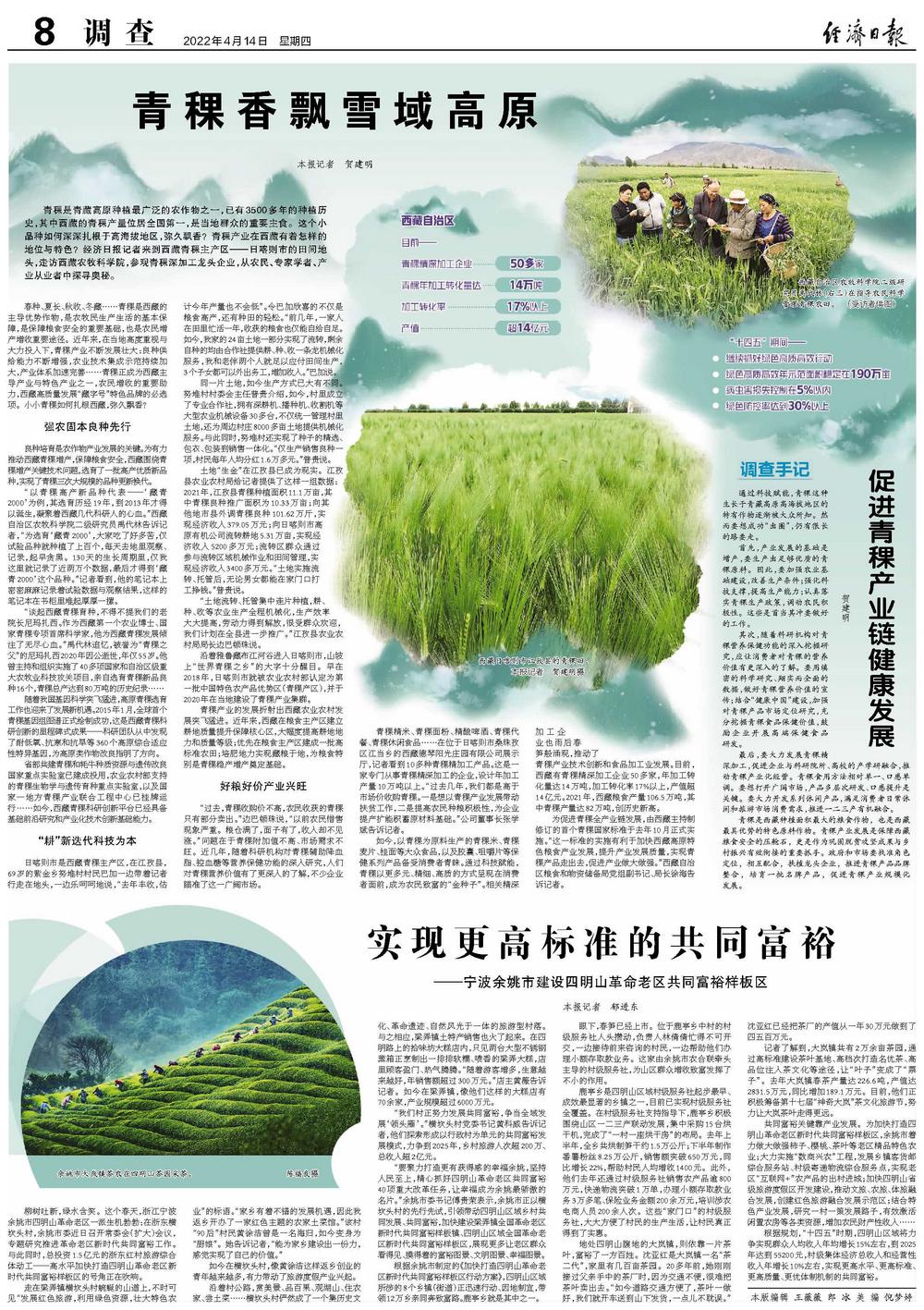 共同富裕关键靠产业发展。为加快打造四明山革命老区新时代共同富裕样板区,余姚市着力做大做强柿子、樱桃、茶叶等老区精品特色农业;大力实施“数商兴农”工程,发展乡镇客货邮综合服务站、村级寄递物流综合服务点,实现老区“互联网+”农产品的出村进城;加快四明山省级旅游度假区开发建设,推动文旅、农旅、体旅融合发展,创建红色旅游融合发展示范区;结合特色产业发展,研究一村一策发展路子,有效激活闲置农房等各类资源,增加农民财产性收入……