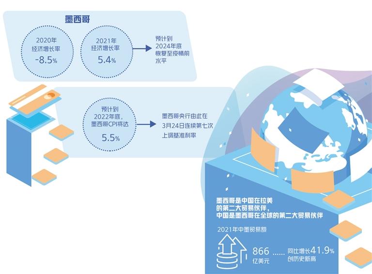 今年是中国和墨西哥建交50周年。50年来,特别是2013年两国建立全面战略伙伴关系以来,双边关系发展进入快车道,互利经贸合作成果丰硕。墨西哥是中国在拉美的第二大贸易伙伴,中国是墨西哥在全球的第二大贸易伙伴,2021年中墨双边贸易额再创历史新高,同比增长41.9%,达866亿美元。墨西哥还是中国在拉美重要的承包工程市场和投资目的地。截至2021年底,中国企业累计在墨签订承包工程合同额178.4亿美元,2021年中国企业在墨新签合同额30.4亿美元。
