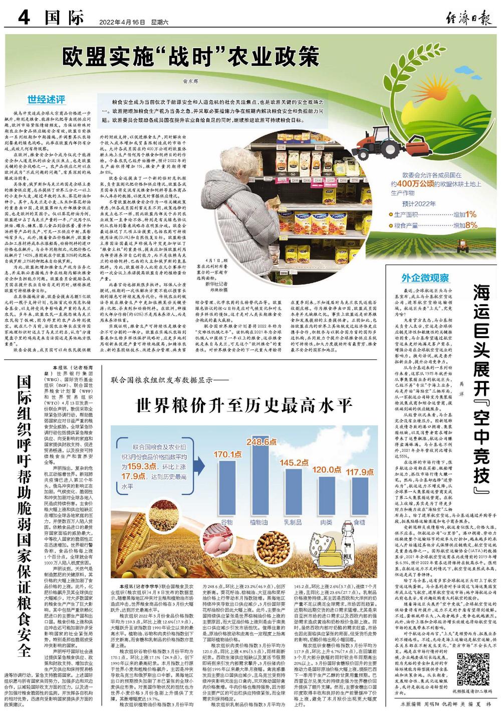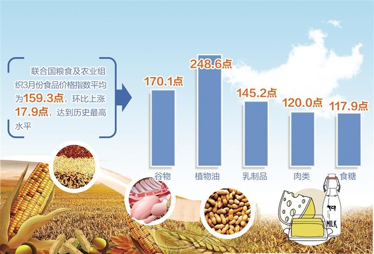 本报讯(记者李学华)联合国粮食及农业组织(粮农组织)4月8日发布的数据显示,随着黑海地区冲突对主粮和植物油市场造成冲击,世界粮食商品价格在3月份大幅跃升,达到历史最高水平。