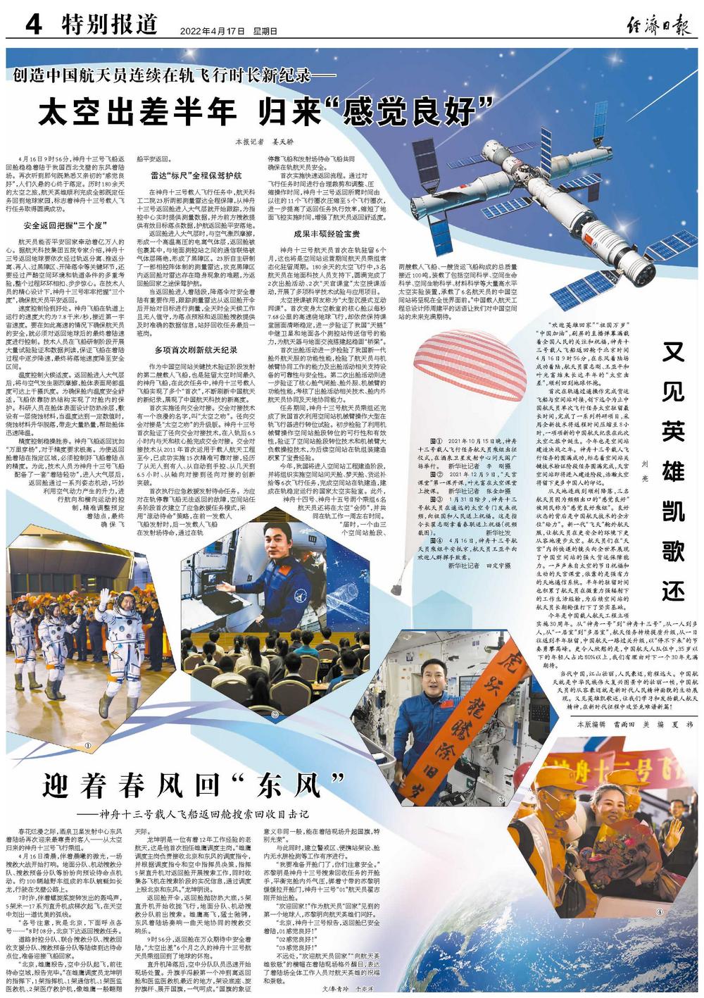 神舟十三号航天员首次在轨驻留6个月,这也将是空间站运营期间航天员乘组常态化驻留周期。180余天的太空飞行中,3名航天员在地面科技人员支持下,圆满完成了2次出舱活动、2次“天宫课堂”太空授课活动,开展了多项科学技术试验与应用项目。