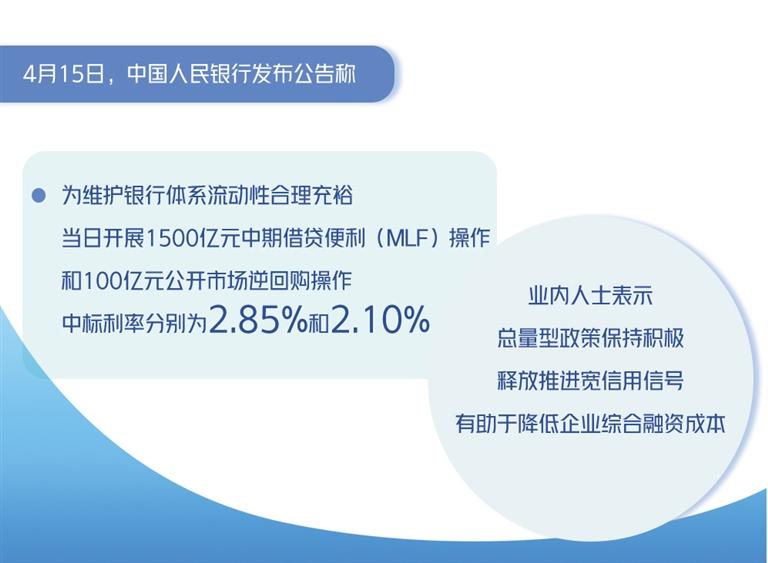 降准预期下,市场对政策利率的操作也格外关注。4月15日,中国人民银行发布公告称,为维护银行体系流动性合理充裕,当日开展1500亿元中期借贷便利(MLF)操作和100亿元公开市场逆回购操作,中标利率分别为2.85%和2.10%,均与上月持平。