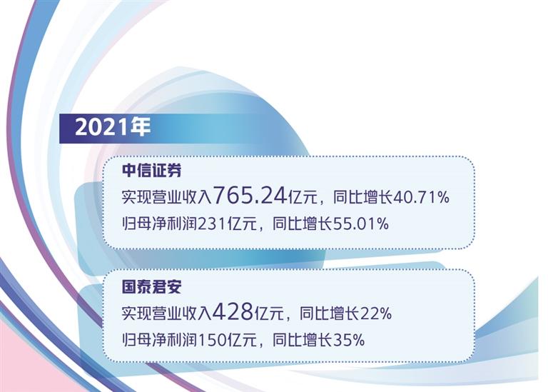 2021年,中信证券实现营业收入765.24亿元,同比增长40.71%;归属于母公司股东的净利润231亿元,同比增长55.01%;无论是在投行业务还是资管规模上,中信证券仍然保持市场第一的位置。国泰君安全年实现营业收入428亿元,同比增长22%;归母净利润150亿元,同比增长35%。