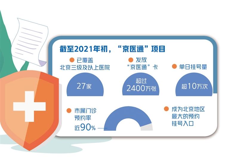 据了解,京医通是北京市卫健委、市医院管理中心与北京银行联合发行的,具有电子钱包功能的实名制IC就诊卡,可在医院作为就诊卡使用,并实现小额支付功能。数据显示,截至2021年初,该项惠民工程已覆盖北京27家三级及以上医院,发放“京医通”卡超过2400万张,单日挂号量超10万次,市属门诊预约率近90%,成为北京地区最大的预约挂号入口。