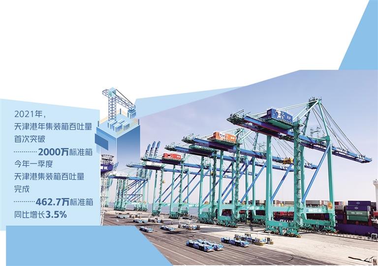近几年,天津港集团发力建设智慧绿色枢纽港口,实现传统集装箱码头自动化升级改造,并推出“智慧零碳”码头,多项领域走在行业前列,闯出了一条智慧港口发展新路。2021年,天津港年集装箱吞吐量跃上2000万标准箱新台阶。今年一季度,天津港集装箱吞吐量完成462.7万标准箱,同比增长3.5%,创历史新高。
