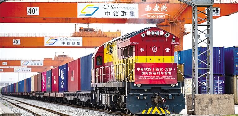 4月22日,陕西西安首趟中老铁路(西安—万象)国际货运列车从西安国际港站发车,标志着陕西至东南亚地区又多了一条国际物流新通道。刘 翔摄(中经视觉)