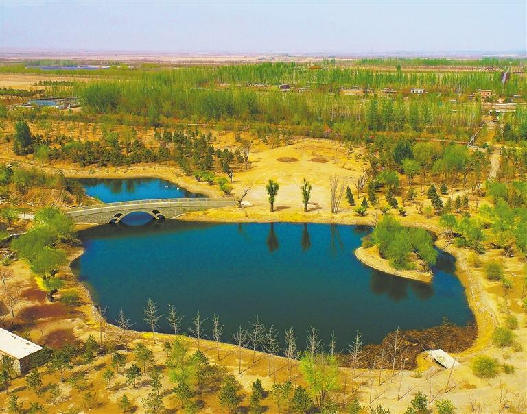① 航拍坐落在宁夏贺兰山脚下的贺兰山运动休闲公园。这里原是砂石采矿塌陷区,银川市通过植被景观再造、水系建设等方式,用各类废弃建筑材料将其打造成一座生态主题公园。袁宏彦摄(中经视觉)