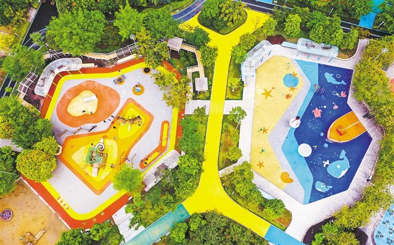 ④ 俯瞰福建省福州市儿童公园。公园将儿童活动空间与城市绿化相结合,成为集亲子活动与城市空气净化于一体的公共空间。