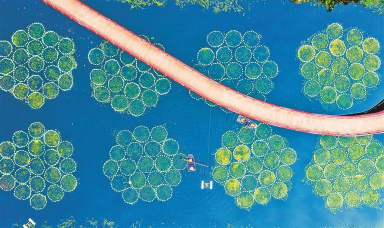 ⑤ 江苏省海安高新区鹰泰生态安全缓冲区,环卫工人在管护生态浮岛里种植的水生植物。海安市坚持工程治污与生态修复并重,充分发挥自然生态系统的净化降解功能,实现“污水零直排、尾水再利用”。翟慧勇摄(中经视觉)