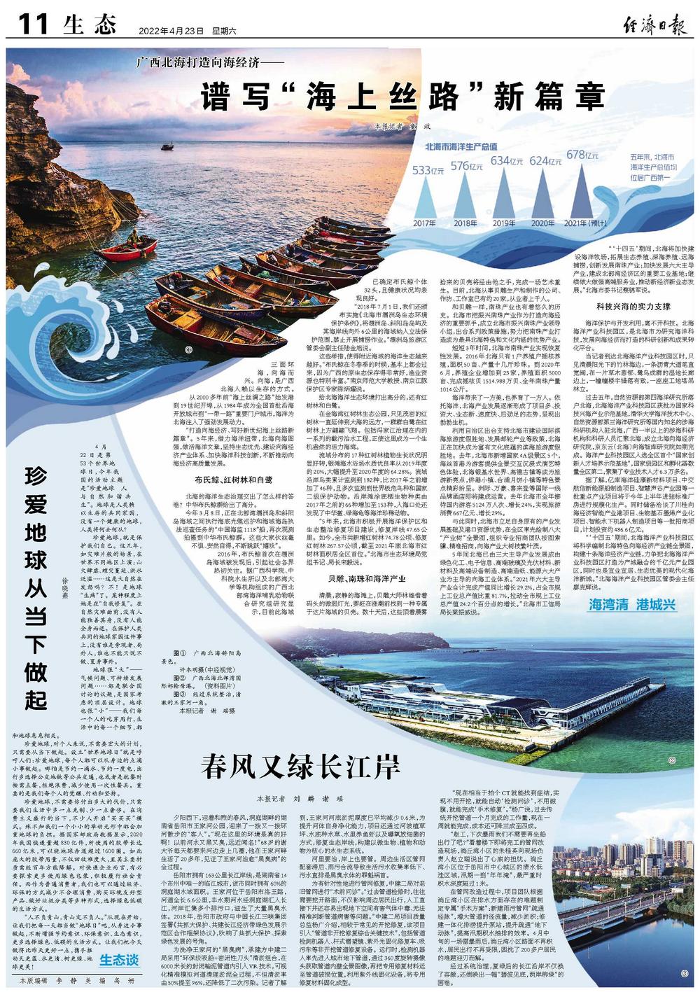 “打造向海经济、写好新世纪海上丝路新篇章”。5年来,借力海洋纽带,北海向海图强,做活海洋文章,坚持生态优先、建设向海经济产业体系、加快海洋科技创新,不断推动向海经济高质量发展。