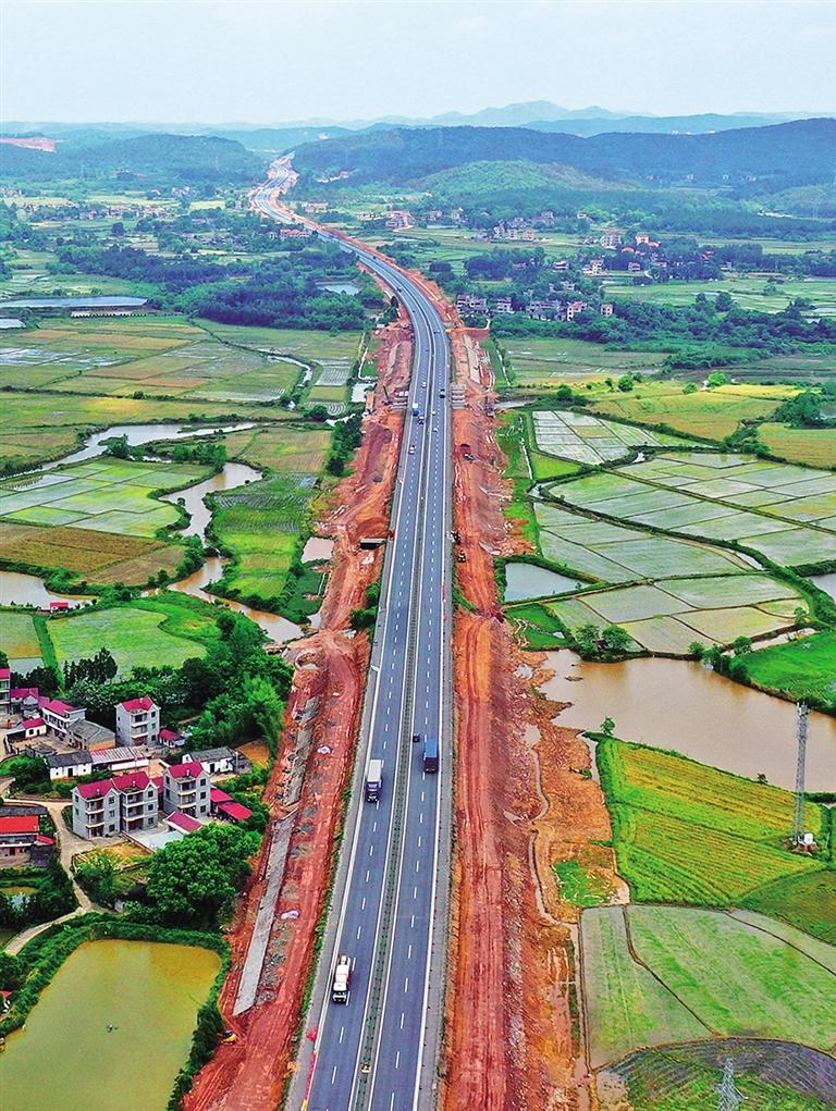 四月二十四日,江西省泰和县马市镇,俯瞰正在加紧扩建的大广高速公路吉康段。该段改扩建项目施工总里程145.4公里,双向四车道改为双向八车道,是迄今为止江西省内一次性“四改八”建设里程最长、投资最大的项目。