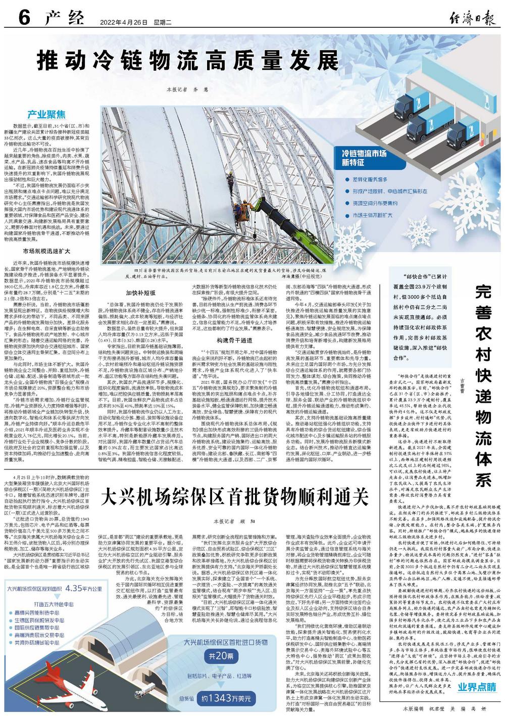 “我们发挥北京市服务业扩大开放综合示范区、自由贸易试验区、综合保税区‘三区’政策叠加优势,积极研究争取更多创新政策和改革举措落地,为大兴机场综合保税区创新发展提供有力支持。”北京海关尹娇副处长说。据悉,大兴机场综保区依托区港一体化发展实际,探索建立了全国首个“一个系统、一次理货、一次查验、一次提离”的高效通关监管模式,结合现有“两步申报”“先入区、后报关”监管模式,大幅提升了货物通关时效。