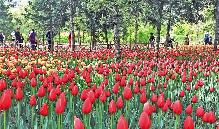 5月1日,游客在甘肃省漳县植物园欣赏郁金香。近期,该植物园种植的大面积郁金香竞相盛开,吸引了众多游客前来赏花游玩,欢度假日。陈永刚摄(中经视觉)