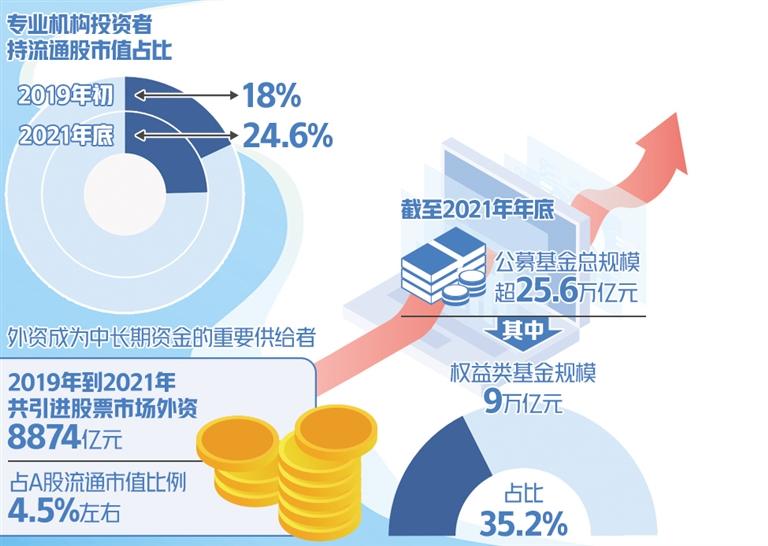 近年来,机构投资者持股占A股流通市值比例总体呈上升趋势。数据显示,专业机构投资者持流通股市值占比从2019年初的18%,上升至2021年底的24.6%。同时,外资逐渐成为中长期资金的重要供给者。证监会副主席方星海在博鳌亚洲论坛2022年年会上表示,这几年引进境外机构投资者资金取得较大进展,2019年至2021年共引进股票市场外资8874亿元,占A股流通市值比例4.5%左右。