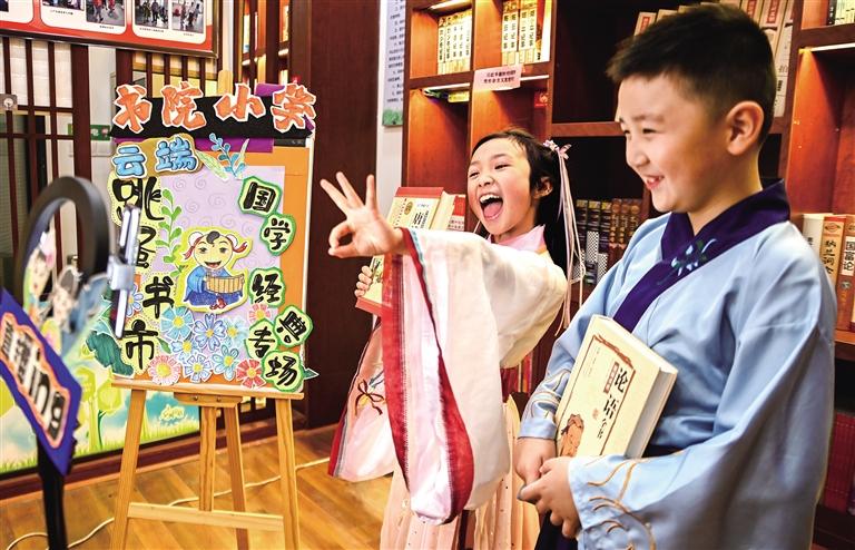 ③ 5月3日,江西省南昌市书院小学读书社学生在东书院社区进行“五一”线上“国学经典”“云端跳蚤书市”网络直播。陈 莉摄(中经视觉)