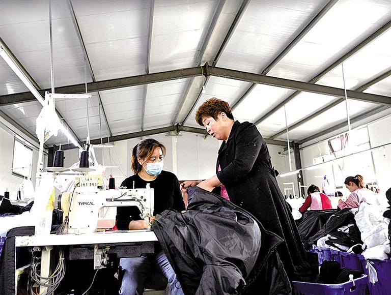 5月5日,位于山东省阳谷县李台镇路庄村党支部领办的羽绒服加工车间,工人们正忙着赶制服装出口订单。近年来,阳谷县通过“党支部+返乡创业能人+党员服务+群众参与”模式,发展小微企业,带动农村妇女实现家门口就业增收。潘海杰摄(中经视觉)