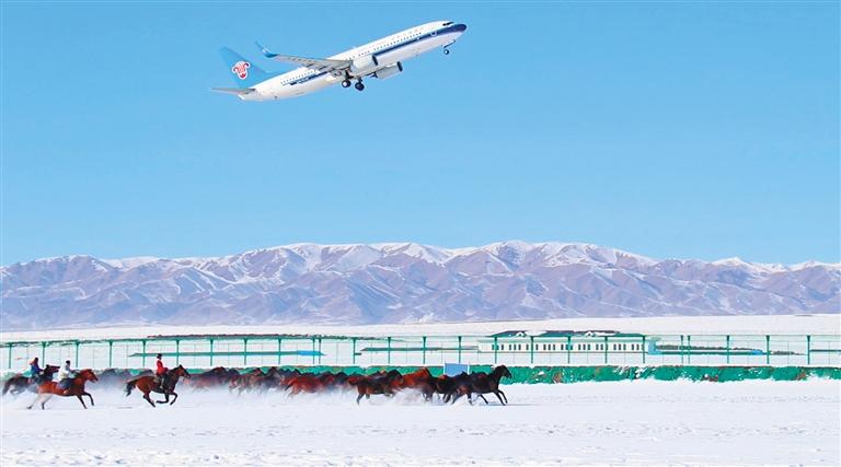 ▼1月28日,新疆昭苏天马机场举行首飞仪式,各族牧民为庆祝首飞,赶着马群在机场外的雪地里奔跑伴飞。李文武摄