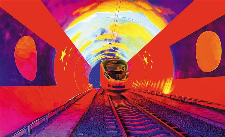 ◀二月二十四日,“澜沧号”动车组通过中老铁路友谊隧道内的中老两国边界。中老铁路是一条连接中国昆明和老挝万象的电气化铁路。杨永全摄