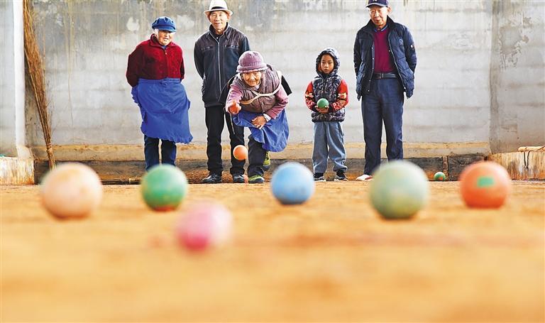 ▲2月5日,云南省玉龙县拉市镇丰乐村,87岁的纳西族老人木润生(中)和村民一起体验地掷球运动。