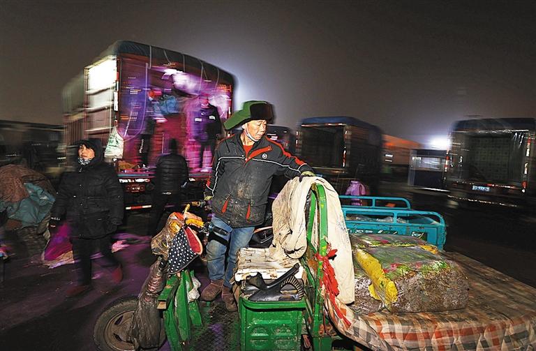 ▶1月25日凌晨,北京新发地蔬菜批发市场,56岁的徐文在装运韭菜。