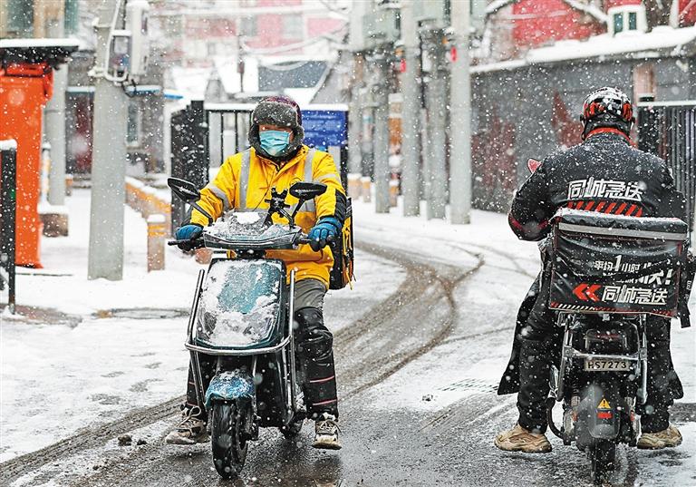 ▼2月13日,北京迎来农历虎年首场降雪,外卖小哥冒雪为顾客送餐。贾天勇摄