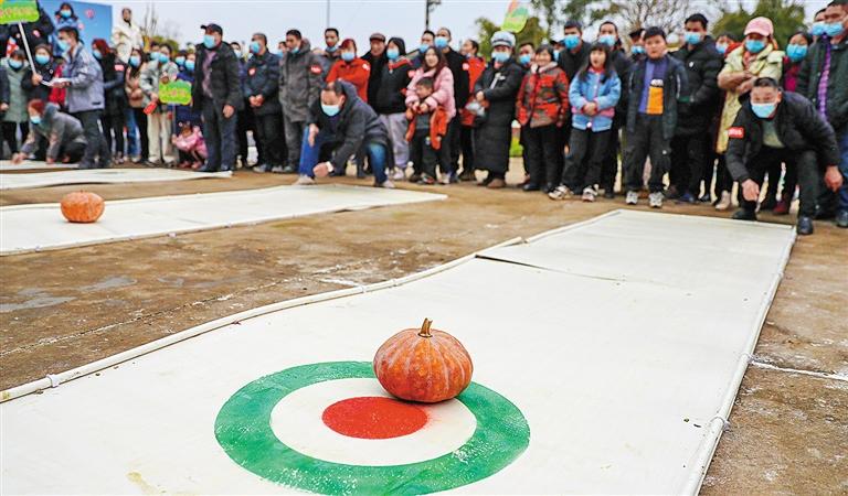 ▼1月26日,四川省华蓥市永兴镇马架坪村,村民通过参加旱地冰壶等趣味运动,喜迎北京冬奥会。邱海鹰摄