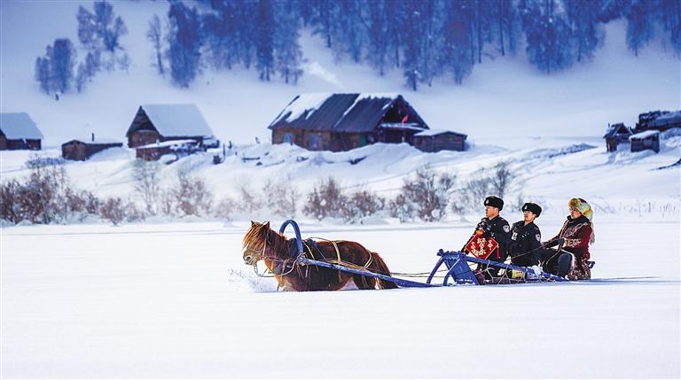 ▶1月27日,新疆出入境边防检查总站喀纳斯大队禾木边境派出所民警和护边员,在厚厚的积雪中乘坐“爬犁警车”给困难群众送年货。