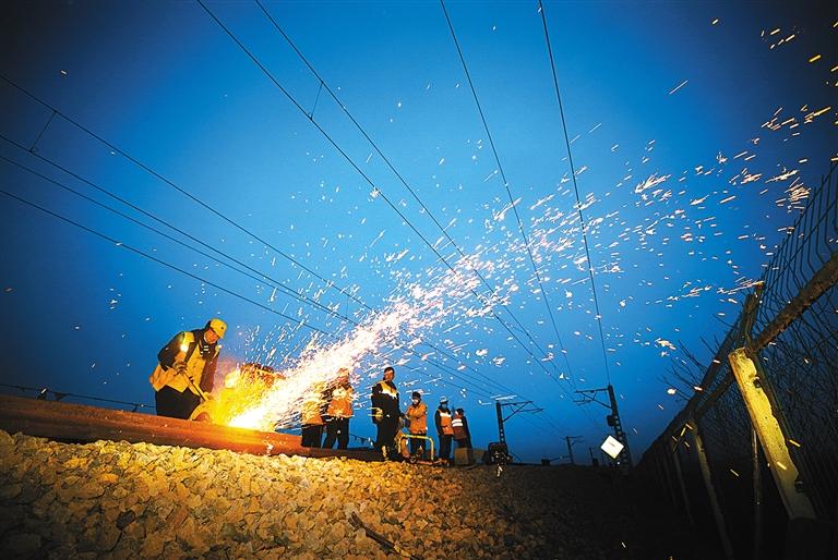 ◀2月14日傍晚,中国铁路郑州局集团有限公司南阳工务段职工在对钢轨进行切割作业。张中海摄